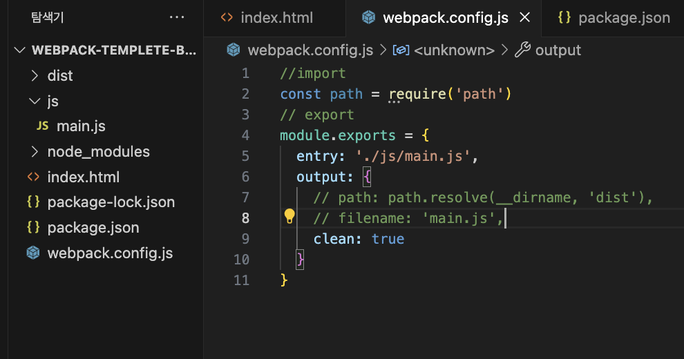 루트경로에 webpack.config.js 생성해서 entry, output 구성 옵션 지정