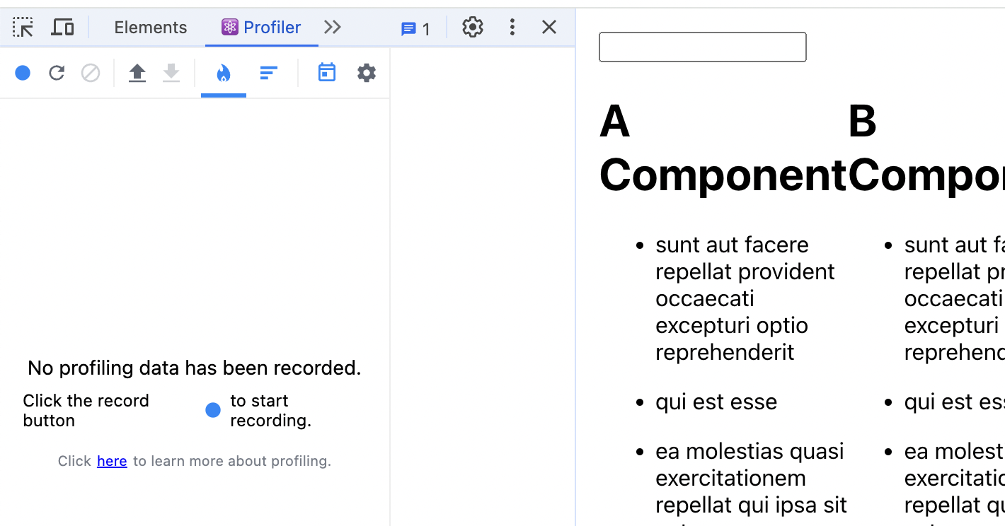 https://chromewebstore.google.com/detail/react-developer-tools/fmkadmapgofadopljbjfkapdkoienihi?pli=1 React Developer Tools - Chrome 웹 스토어Adds React debugging tools to the Chrome Developer Tools. Created from revision ccb20cb88b on 7/3/2024.chromewebstore.google.com React Profiler (성능 측정) 가짜 데이터 가져오기 성능을 측정하기 위해 많은 데이터가 필요하기에 가짜 데이터를 받아옴 useEffect () => { fetch('https://jsonplaceholder.typicode...